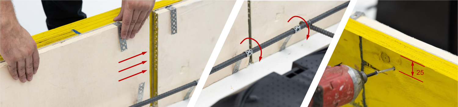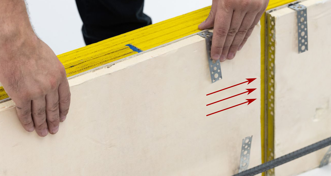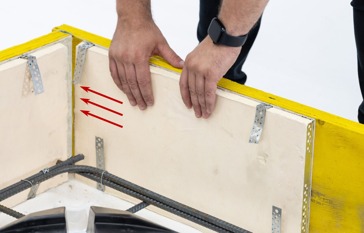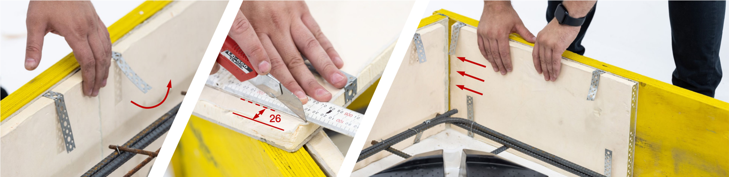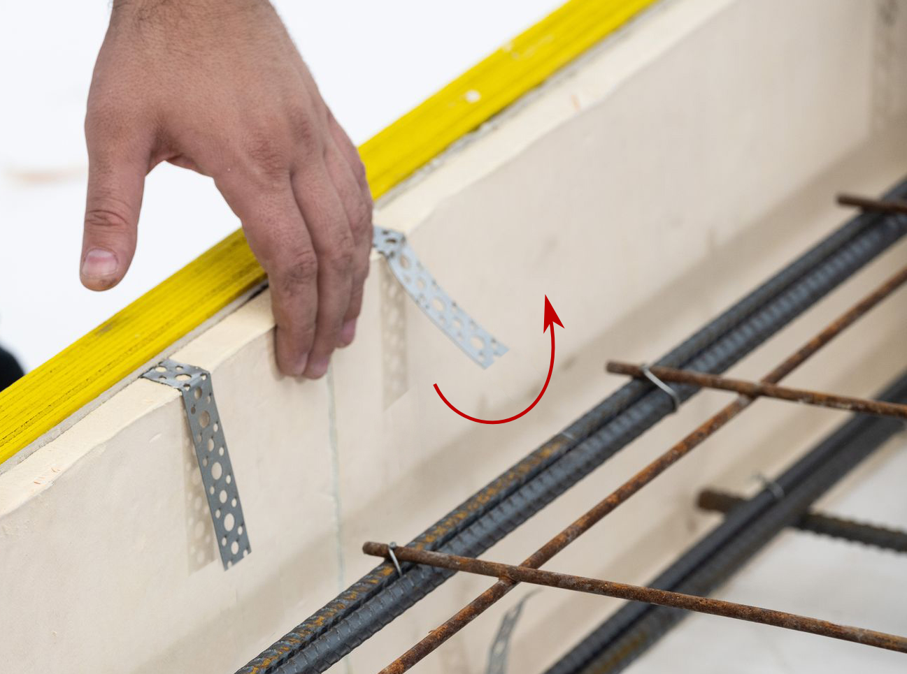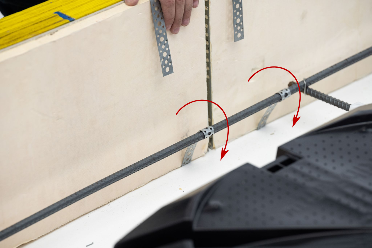 2. Secure the boards by folding the lower clips around the reinforcing bars of the foundation.